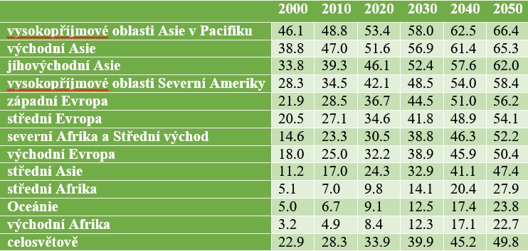Podíl krátkozrakých v populaci vybraných regionů a odhad budoucího vývoje (%)
