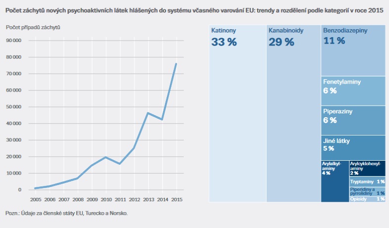 Problém se týká i České republiky – podle Národního monitorovacího střediska pro drogy a závislosti zaznamenal během roku 2015 náš systém včasného varování celkem 35 nových psychoaktivních látek, z toho 11 vůbec poprvé a v případě jedné látky šlo o první výskyt v zemích EU. Nejčastěji šlo o katinony (10 látek), syntetické kanabinoidy (8 látek) a fenetylaminy (7 látek).