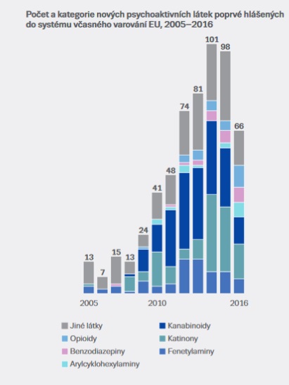 Ačkoliv se přitom nové psychoaktivní látky monitorují už dvacet let – v současnosti v Evropě funguje třicet národních systémů včasného varování -, význam narůstá zejména v posledních letech. Zatímco od roku 1997 bylo zaznamenáno kolem 660 nových drog, 150 výstrah týkajících se veřejného zdraví a 23 hodnocení rizik, k necelé polovině těchto událostí došlo v posledních čtyřech letech. Od roku 2014 bylo nově detekováno kolem tří set látek, došlo k padesátce výstrah souvisejících s veřejným zdravím (obvykle v návaznosti na úmrtí na předávkování některou z látek, nebezpečnými vedlejšími účinky či kontaminací drogy) a proběhlo 12 hodnocení rizik, na jejichž základě se pak dělají další rozhodnutí. Pouze v roce 2016 bylo v EU nově zachyceno 66 látek, což je ovšem o něco méně než v předchozích dvou letech.