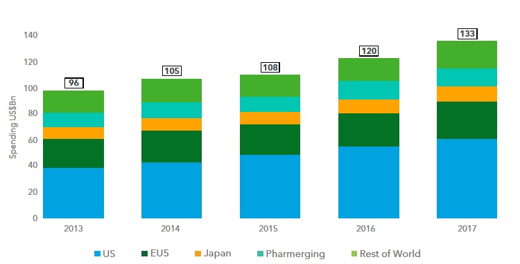 Situace není nijak růžová ani celosvětově, i když náklady nerostou tak rychle jako v USA. „Světový trh s terapeutickými onkologickými léky dosáhne do roku 2022 200 miliard dolarů, což znamená průměrný růst o 10 až 13 procent v následujících pěti letech. Americký trh přitom do roku 2022 dosáhne 100 miliard s průměrným růstem o 12 až 15 procent,“ předpovídá zpráva. USA za onkologické léky před pěti lety daly 25 miliard dolarů, loni to už byl dvojnásobek. Celosvětově pak dojde ke zdvojnásobení částky placené v roce 2013 do roku 2022.