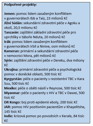České zdravotnictví se potýká s nemalým množstvím problémů, přesto však navzdory svým mouchám zajišťuje kvalitní a dostupnou péči. Takové štěstí však lidé z mnoha jiných (ne-li z většiny) států na světě nemají. Dobře si to uvědomuje celkem 68 tisíc českých dárců podporujících Lékaře bez hranic, díky kterým šlo na pomoc do 13 zemí postižených válkou, konfliktem, přírodní katastrofou či chudobou přes 80 milionů korun. Několik desítek českých a slovenských dobrovolníků se pak rozhodlo pomoci přímo na místě a vyjelo tak s Lékaři bez hranic (MSF) do celkem dvaceti zemí včetně válkou sužovaného Jemenu nebo Demokratické republiky Kongo, kde vedle konfliktu řádí i celosvětově druhá největší epidemie eboly.