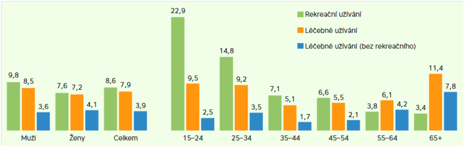 Podle výroční zprávy o užívání drog za loňský rok jsou konopné látky nejčastěji konzumovanou nelegální drogou v Česku. V životě je vyzkoušela zhruba třetina dospělých a v posledním roce necelá desetina. ČR zároveň patří k zemím s nejvyšší mírou užívání konopí mezi dětmi a mládeží, zkušenosti s jeho užíváním má přibližně pětina mladých lidí mezi 15 a 24 lety. V rámci skupiny osmnáctiletých se jedná o celou polovinu z nich a 41 procent jich pak užilo konopné látky v posledním roce.