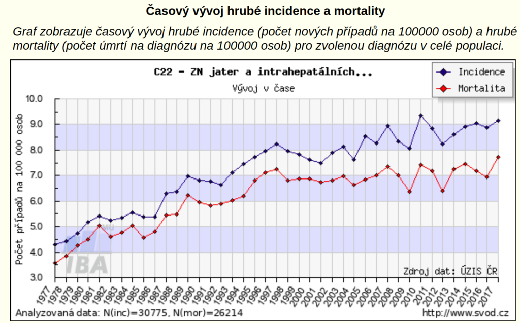 Další skupinou, na kterou se spolupráce IKEM a VFN zaměřuje, jsou pacienti s primárním nádorem jater. Těch je dnes ročně diagnostikováno více než devět set, přičemž muži onemocněním trpí podstatně častěji než ženy – z každých sta tisíc obyvatel se ročně dozví diagnózu rakoviny jater 11 mužů a šest žen. Nejčastějším rizikovým faktorem, který má 90 procent pacientů, je jaterní cirhóza, obvykle alkoholická. Bohužel jde přitom o nádor s vysokou mortalitou, kdy se pacienti v rozvinutém stadiu onemocnění jen málokdy dožijí dvou let od diagnózy. Diagnóza tak je celosvětově třetí nejčastější příčinou úmrtí v rámci onkologických onemocnění.