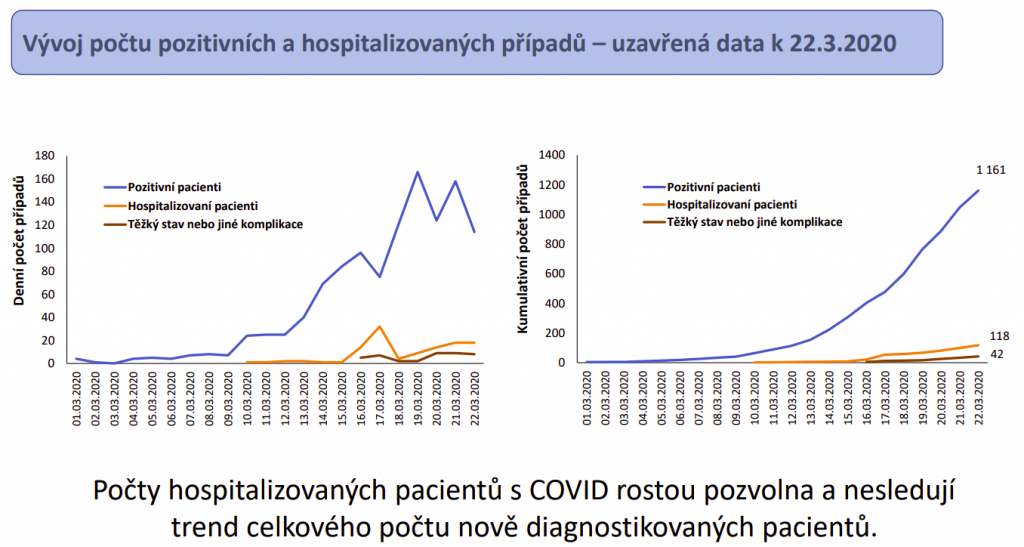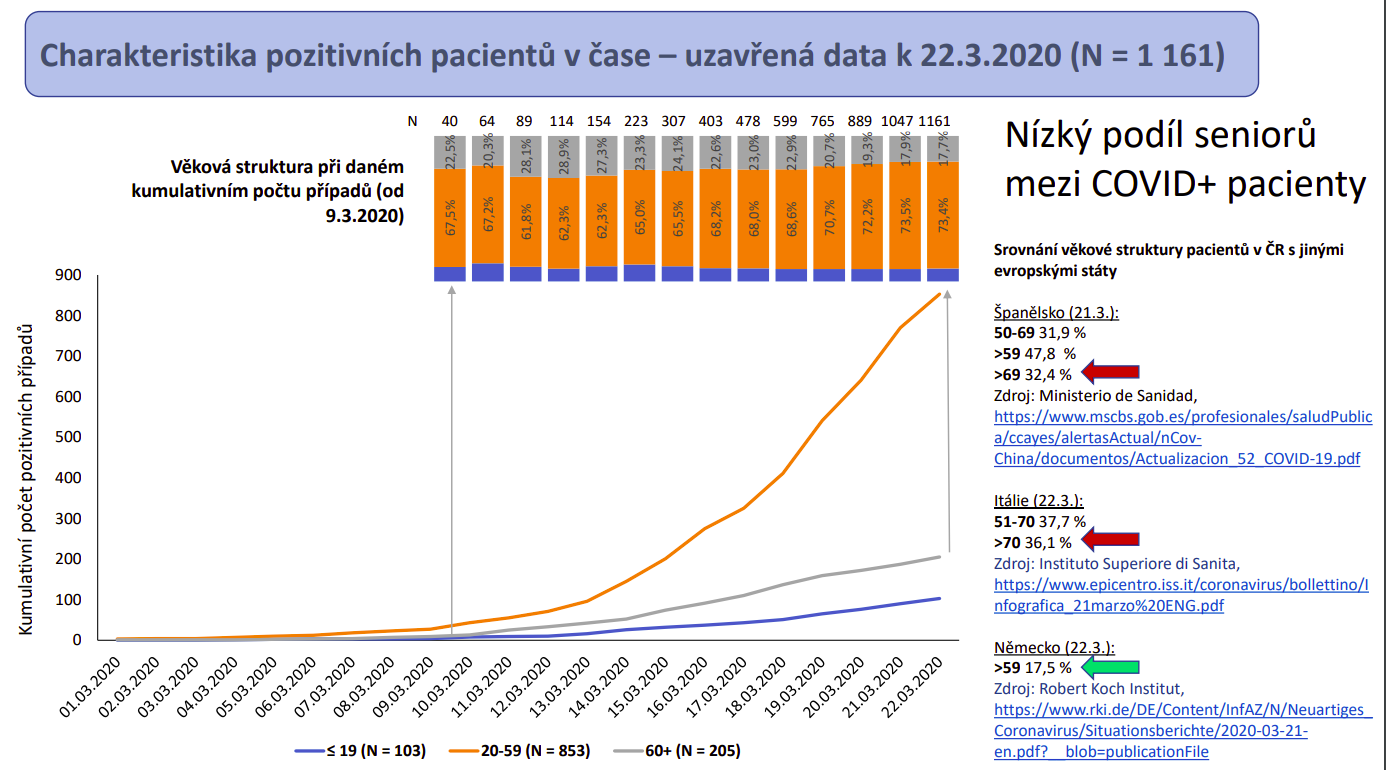 Počet potvrzených nákaz ale v tuto chvíli podle odborníků není důležitý – zásadní je věková struktura pacientů. „Je lhostejné, kolik v následujících dnech a týdnech naměříme pozitivních jedinců, protože nemoc je infekční a v nějakém rozsahu populací projde – to je příroda. Je ale nezbytné hlídat zásah do seniorní populace a do populace vážně nemocněných lidí, kde morbidita a dopady nemoci jsou velmi závažné. Z dostupných dat se mi v tuto chvíli jeví, že se to v tuto chvíli v naší republice děje, a kéž by to tak pokračovalo dál,“ podtrhává Dušek. Vedle seniorního věku je podle doposud dostupných dat rizikovým faktorem pro těžký průběh také cukrovka, zejména dekompenzovaná, a hypertenze. Je dost možné, že se do této skupiny brzy přidají také pacienti na aktivní protinádorové léčbě.