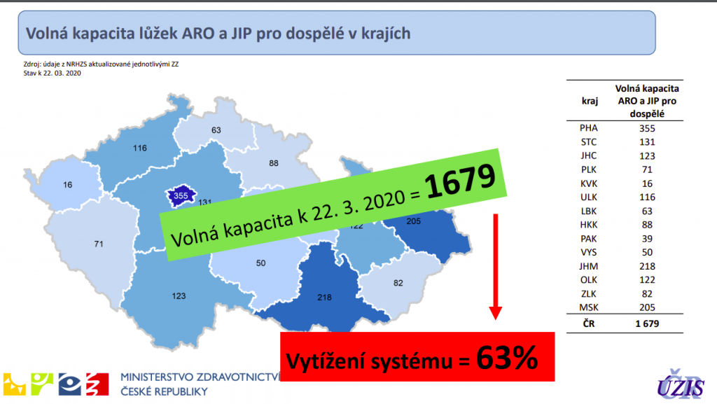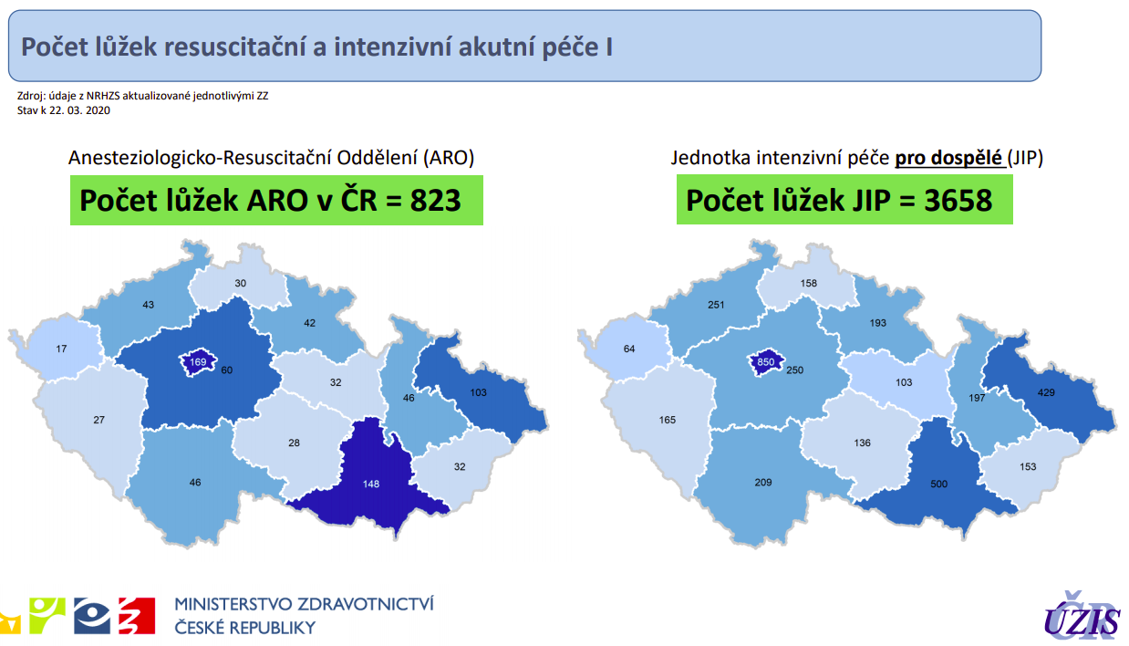 V Česku máme nyní na ARO a intenzivní péči dohromady 4481 lůžek, přičemž vytížení systému je na 63 procentech. To znamená, že máme volných 1679 těchto lůžek. „Když se podíváte na situaci ve vztahu ke kapacitě intenzivní péče v Německu, vychází z toho Česko mnohem a mnohem lépe. V tuto chvíli si myslím, že Česko je na špici zemí EU z pohledu kapacity lůžek intenzivní péče,“ podtrhává předseda České společnosti anesteziologie resuscitace a intenzivní medicíny Vladimír Černý. Lůžek s umělou plicní ventilací u lůžek na ARO či JIP je celkem 2080, a to bez ventilátorů z dětské intenzivní péče a neonatologie. V současnosti je kapacita využita ze 39 procent. Mimotělních oběhů ECMO pro výjimečné případy pacientů se selháním plicních funkcí pak máme k dispozici 72.