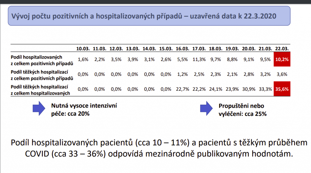 Že nejdeme ve stopách těchto dvou států, potvrzují také počty hospitalizovaných. Nejčastěji u nás nákaza zasáhne obyvatele, kteří ji ustojí, aniž by skončili v nemocnici. Oproti tomu těch nejzávažnějších případů s těžkým průběhem je velmi málo. V nemocnici dnes skončí kolem deseti procent diagnostikovaných, z nichž třetina jsou těžké hospitalizace. Vysoce intenzivní péči typu ventilace nebo plicní podpory ECMO vyžaduje zhruba pětina hospitalizovaných.