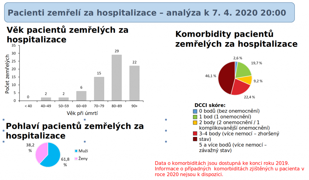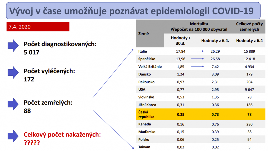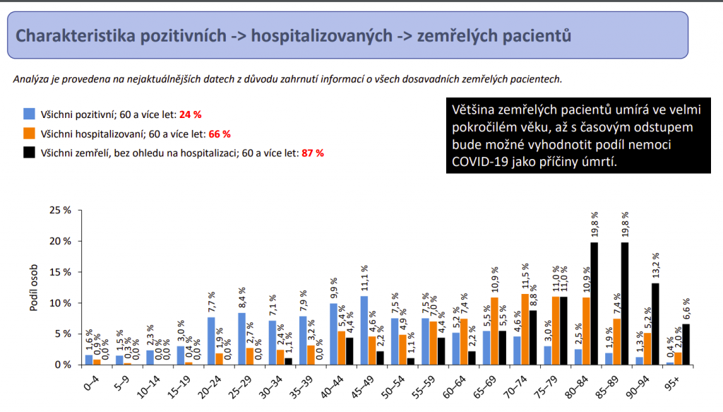 Důležité také je, co vlastně ona v současnosti reportovaná stovka úmrtí pacientů s covid-19 vypovídá. „Naprosto zásadní z hlediska vnímání čísla, kdo zemřel, je to, že podstatná část pacientů, kteří zemřou, zemřou s covid, ale ne na covid,“ dodává Vladimír Černý.