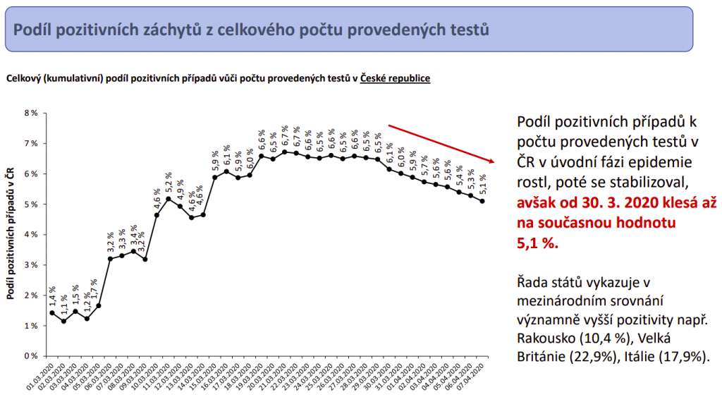 Ministr Vojtěch každopádně poukazuje na to, že ačkoliv se počet provedených testů zvedá – v úterý bylo otestováno 7400 vzorků -, procento pozitivních klesá (v úterý šlo o necelé dvě stovky pacientů, tedy 2,6 procenta). Zároveň klesá také podíl pozitivních záchytů z celkového počtu provedených testů. Zatímco v první fázi epidemie podíl rostl, následně se stabilizoval a od konce března klesá na současnou hodnotu 5,1 procenta. Co se pak týče počtu unikátně testovaných lidí, je číslo o něco málo vyšší – pohybuje se kolem šesti procent, nicméně vykazuje podobně klesající trend. Pro srovnání: v Británii je procento záchytů z celkového počtu provedených testů na 23 procentech, v Itálii je to 18 procent a v Rakousku přes deset procent, pokud bychom se pak podívali na druhý konec spektra, na Tchaj-wanu jde o necelé procento, v Jižní Koreji 2,2 procenta a třeba ve Slovinsku 3,5 procenta.