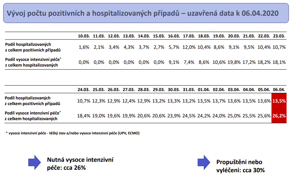 Čísla také ukazují, že nerostou počty lidí, kteří skončí v nemocnici – denní počty hospitalizovaných kvůli covid-19 zůstávají vesměs stejné. Z nově diagnostikovaných tak potřebuje hospitalizaci kolem 10 až 15 procent, z hospitalizovaných pacientů pak zhruba čtvrtina potřebuje vysoce intenzivní péči. Naopak 30 procent lidí už je z nemocnic propuštěno.