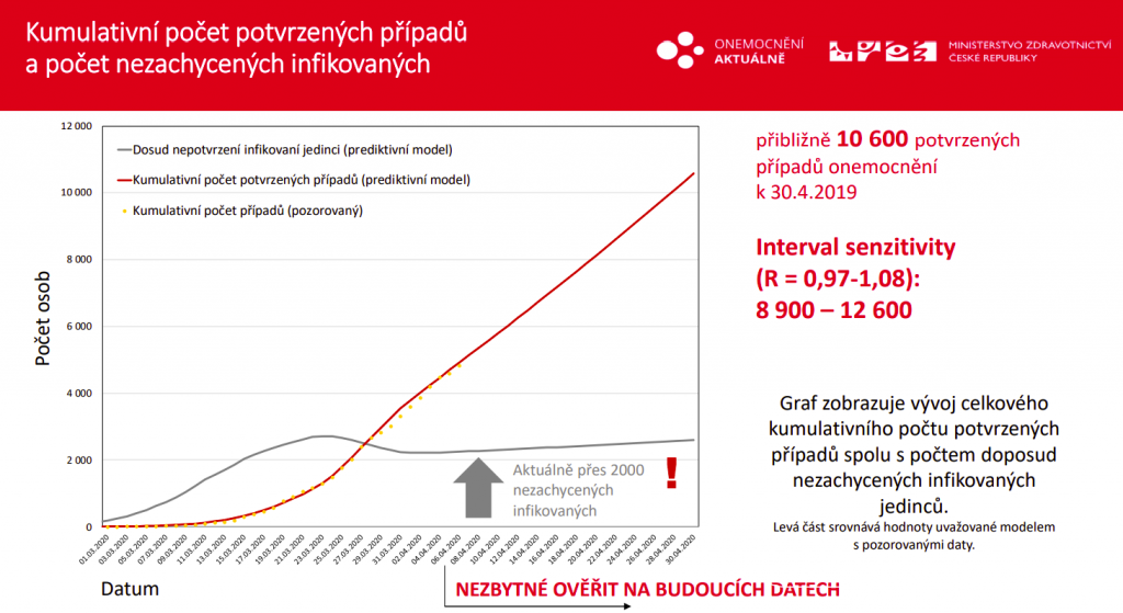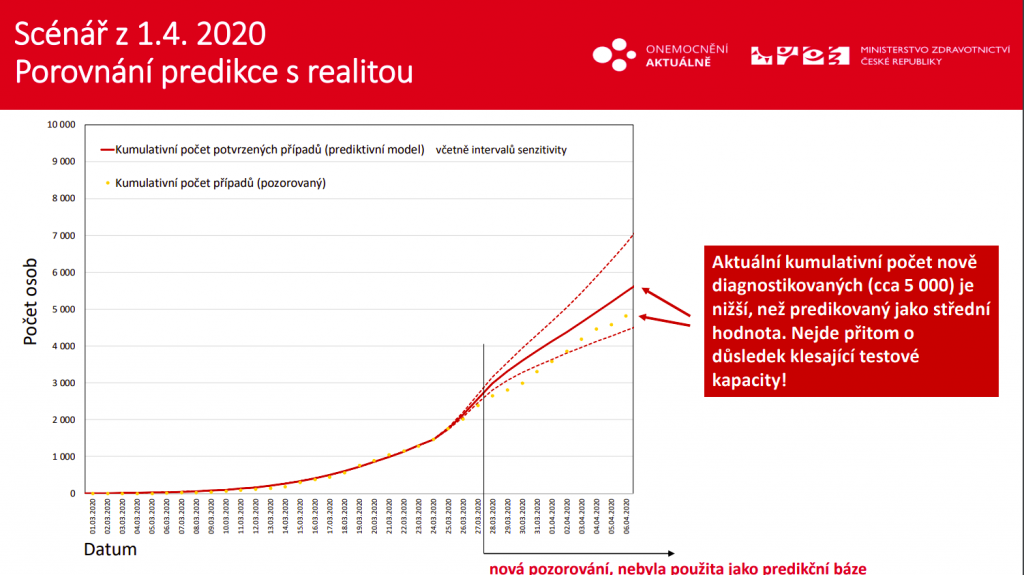 Jaký je aktuální výhled? Minulý týden predikce hovořily o tom, že reprodukční číslo, tedy to, kolik jeden infikovaný nakazí průměrně dalších osob, po 16. březnu, kdy došlo k omezení volného pohybu osob, kleslo na 1,1 s tím, že interval spolehlivosti je 0,87 až 1,33. Ukázalo se přitom, že vývoj se ve skutečnosti pohyboval ve spodní části intervalu – a to navzdory tomu, že počet testů rostl (predikce počítala s cca 5800 případy, ve skutečnosti byl kumulativní počet diagnostikovaných k 7. dubnu 5000). Verifikovaná čísla tak ukázala, že po 16. březnu kleslo reprodukční číslo na 1,02 (s intervalem spolehlivosti 0,97 až 1,08), počet nakažených seniorů pak modelace z minulého týdne odhadla velmi přesně (aktuálně máme asi 1200 pacientů v seniorním věku).