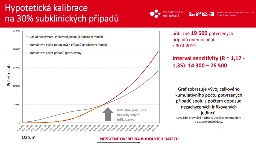 Na základě nových dat tak predikce říkají, že by v Česku mělo být v polovině dubna kumulativně sedm tisíc potvrzených případů (s rozptylem od 6300 do 7700 případů) a na konci měsíce 10 600 nakažených (s rozptylem 8900 až 12 600 případů). Tato modelace přitom počítá s tím, že asymptomatických případů je kolem 10 procent. Objevují se ovšem názory, že číslo může být mnohem větší. Proto ÚZIS vytvořil modelaci, jak by situace mohla vypadat, kdyby asymptomatických bylo 30 procent nakažených. V tom případě by oproti 10 procentní variantě reprodukční číslo po 16. březnu stouplo na 1,26 (s intervalem spolehlivosti 1,17 až 1,35). To by znamenalo ke konci měsíce kumulativně 19 500 potvrzených případů (s intervalem senzitivity 14 300 až 26 500 případů). I tento scénář je ovšem pro české zdravotnictví zvládnutelný, jak už odborníci poukázali před dvěma týdny (psali jsme zde). Jaký scénář je bližší pravdě, by přitom měla ukázat čísla během následujícího týdne.