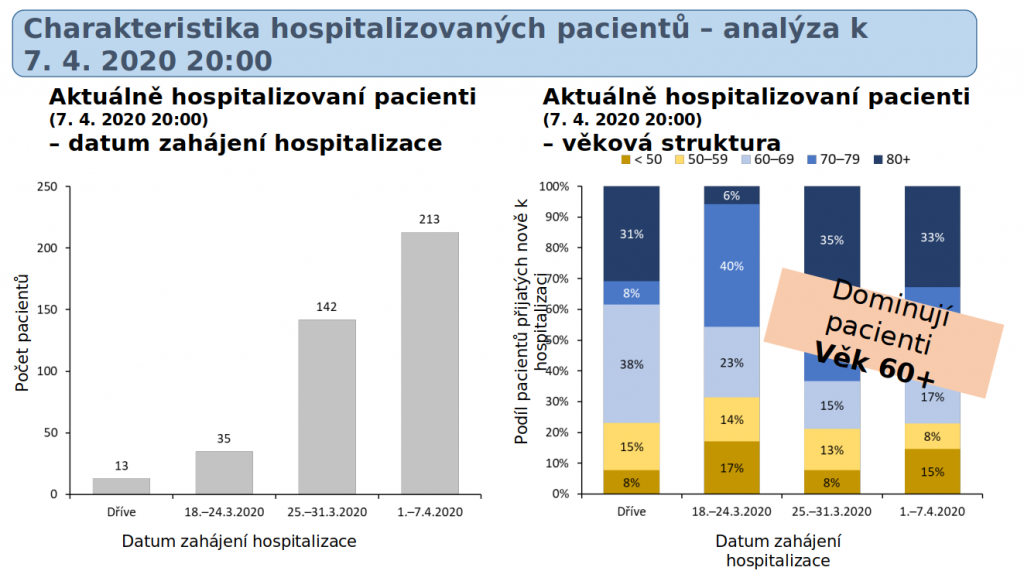 V současnosti je v nemocnicích 403 covid pozitivních pacientů, z nichž 89, tedy 22 procent, je na ARO nebo JIP (64 jich je na umělé plicní ventilaci a dva na ECMO). Z aktuálně hospitalizovaných pacientů bylo 53 procent hospitalizováno v posledním týdnu a dalších 35 procent před jedním až dvěma týdny. Většina lidí v nemocnici je vyššího věku – dominují pacienti nad 60 let. Celkem 218 pacientů pak už bylo z nemocnice puštěno do domácí péče.