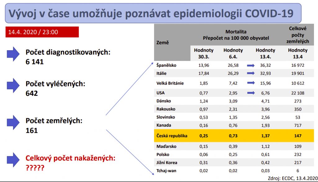 „Modely jsou trochu věštění z křišťálové koule. Když se teď podívám na tři, čtyři měsíce dopředu, přišlo by mi nefér to prezentovat – jestliže vyjdu z předpokladu, že je tu 10 procent subklinických případů, republika byla zatažena do nouzového stavu dramaticky rychle a nemoc se tu nezačala šířit, tak to znamená, že je to všechno před námi a minimálně ještě 50 procent obyvatel se s nemocí bude muset v nadcházejících měsících setkat. Bude to výzva, jak to zvládneme, aby to všechno neproběhlo během dvou měsíců, protože by to zlikvidovalo akutní péči a byl by to takzvaný nešťastný italský scénář. Nebo je pravda přesně opačná, i když já nevěřím ani na jeden z těchto extrémů. Druhý extrém by byl, že zjistíme, že v populaci je imunizace dostatečně početná a jde třeba o 30 procent lidí v určitých věkových kategoriích. To by byl vážný signál, jak postupovat s rozvolňováním. V tuto chvíli můžeme být rádi, že ukázněnost republiky, byť to má dramatické ekonomické konsekvence, jednoznačně zastavila nekontrolované šíření nemoci. Teď se potřebujeme podívat, ve kterém bodě časoprostoru jsme, abychom dali na stůl dva, tři relevantní scénáře, podle kterých by se mohla řídit ekonomika i vláda. Na to ale jistě budeme potřebovat dva, tři týdny,“ vysvětluje profesor Dušek.