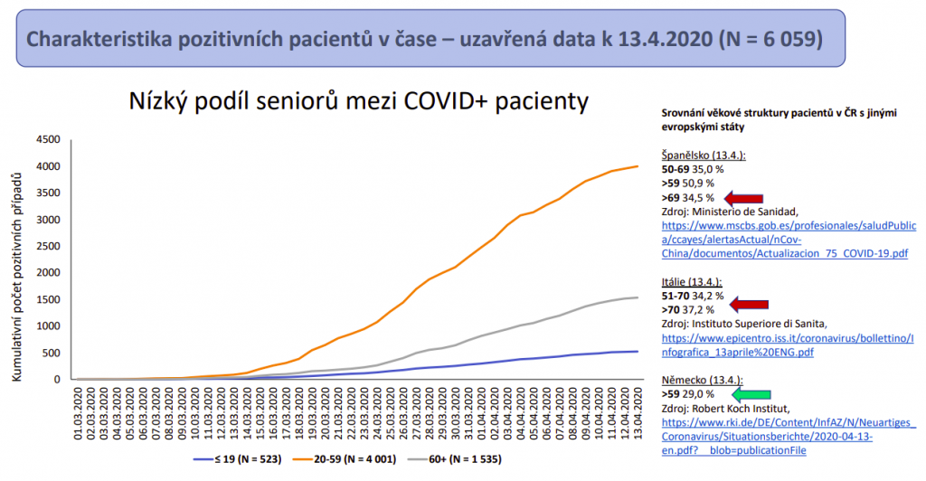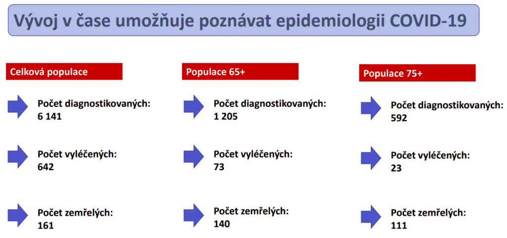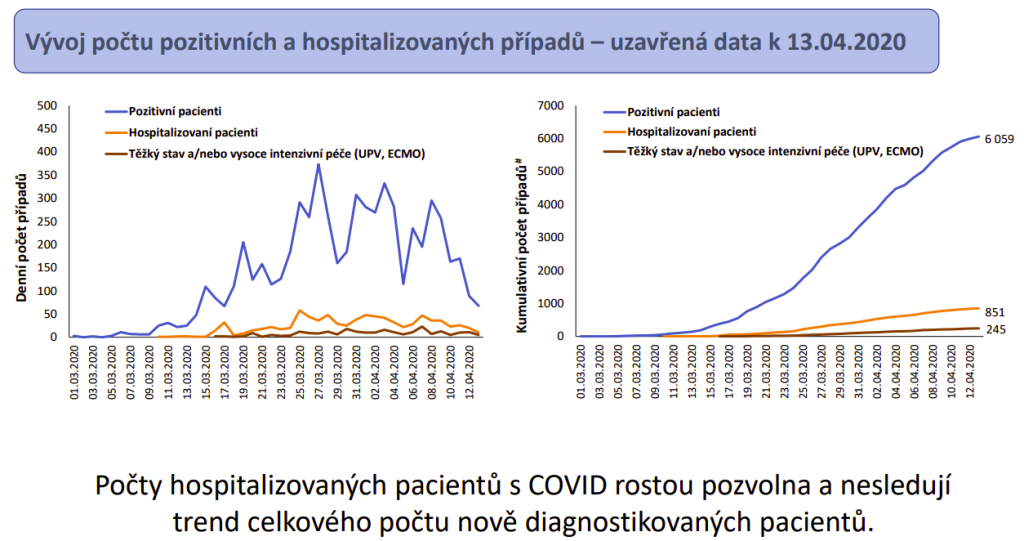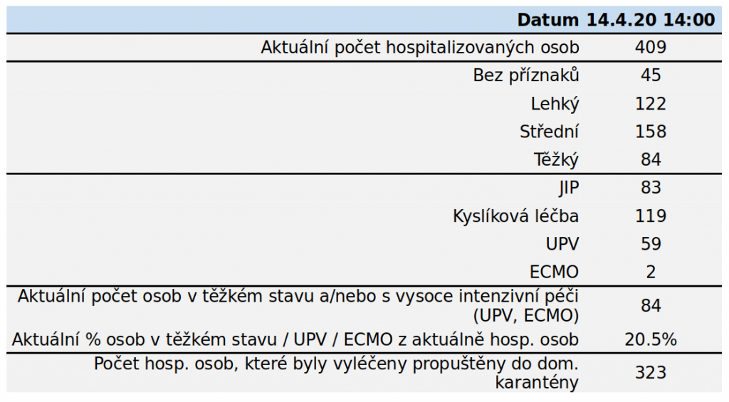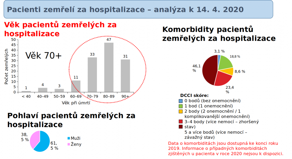 K úternímu dni bylo v nemocnici 409 pacientů, z nichž 84 bylo v těžkém stavu (20,5 procenta). Propuštěno bylo zatím celkem 323 lidí, 130 covid pozitivních pacientů v nemocnicích zemřelo. Většina zemřelých během hospitalizace byla starších 70 let a měla komorbidity. „Naprostá většina pacientů, kteří zemřeli, má výrazné komorbidity – onkologické, dekompenzovaný diabetes, velmi staří pacienti měli i pokročilou demenci, Alzheimerovu chorobu a tak dále. Naprosté minimum lidí bylo takzvaně v uvozovkách zdravých,“ poukazuje Ladislav Dušek, který ovšem dodává, že není možno v reálném čase říci, co bylo primární příčinou úmrtí a jaké příčiny byly sekundární. „V tuto chvíli mezinárodní tým expertů vyvíjí pravidla, jak se bude covid-19 začleňovat do příčin úmrtí. Mortalitní data se vždy prezentují zhruba s půlročním zpožděním. Laicky ale mohu říci, že jsem přesvědčen, že minimálně 50 procent úmrtí nebude z primární příčiny covid-19 – že to byla nemoc, která úmrtí urychlila, ale nebyla primární příčinou,“ dodává Dušek. Předseda České společnosti anesteziologie resuscitace a intenzivní medicíny Vladimír Černý také připomíná, že bychom se na data měli dívat i v kontextu celkového počtu úmrtí – v ČR zemře měsíčně průměrně 9185 lidí (7450 je více než 65 let), tedy 302 lidí denně (247 je více než 65 let).