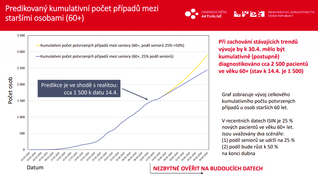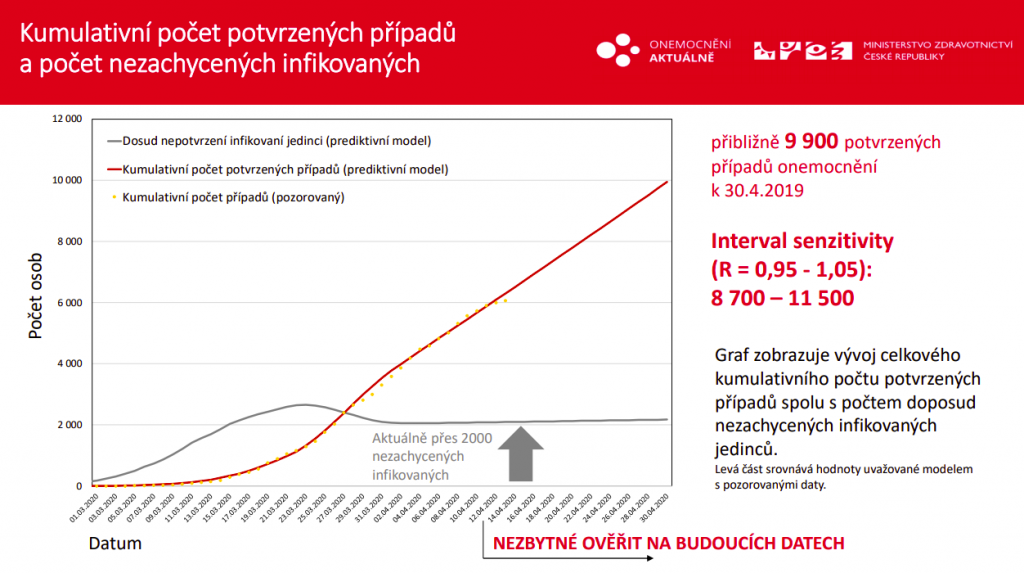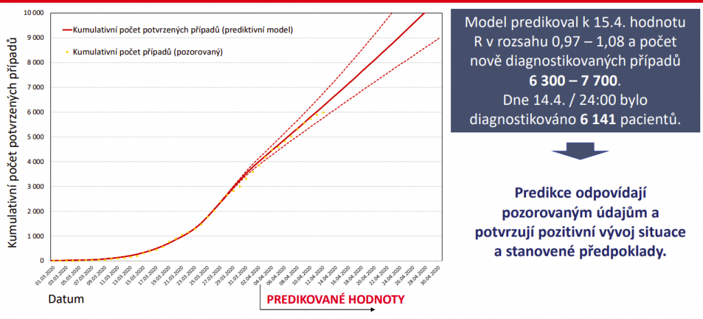 Aktualizované predikce tak počítají s reprodukčním číslem, tedy množstvím lidí, které průměrně nakazí jeden infikovaný, v hodnotě 1 (interval spolehlivosti 0,95 – 1,05). Na konci dubna by kumulativně mělo být diagnostikováno 9900 pacientů (interval senzitivity 8700 až 11 500), ve věku nad 60 let bychom pak měli mít 2500 pacientů. „Modely se zatím trefují, což znamená, že zranitelná populace na sebe dává pozor a lidé většinově dodržují opatření tak, jak mají,“ konstatuje Ladislav Dušek.