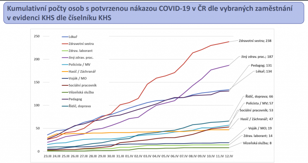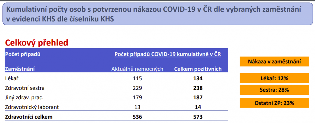 Skupinou, která je bohužel mezi nakaženými velmi často zastoupena, jsou i zdravotníci. Těch bylo na začátku tohoto týdne infikováno 573, nejčastěji zdravotních sester. „I tak jde ale o počty nízké z hlediska celkových kapacit péče a rozhodně zatím nepozorujeme nějaký trend, že by to limitovalo kapacity zdravotních služeb,“ říká k tomu Ladislav Dušek.
