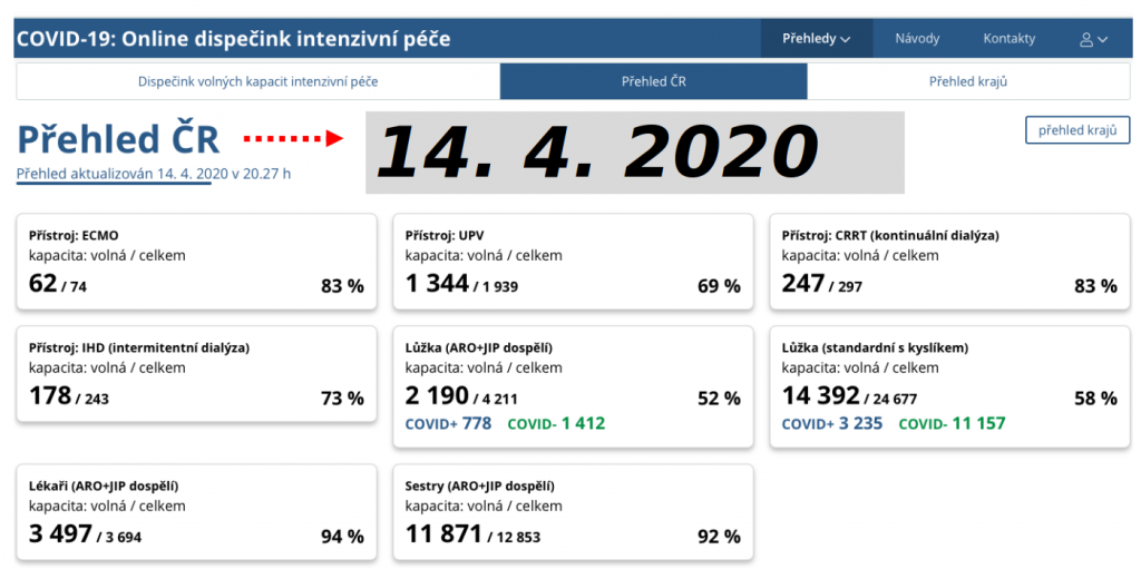 Dobrou zprávou je, že od pondělí funguje dispečink, který monitoruje kapacity péče napříč republikou. V úterý večer podle něj bylo volných 52 procent lůžek intenzivní péče (2190 z 4211, data ovšem zatím nejsou validovaná), 69 procent ventilátorů (1344 z 1939) a 87 procent ECMO (65 ze 74). Data pocházejí z 90 procent nemocnic a ukazují tak, že rezerva systému je poměrně velká, takže by se dokázal vypořádat i s méně příznivými scénáři vývoje.