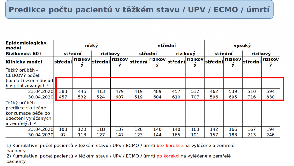 Necelých deset tisíc nakažených na konci dubna – tak zní aktualizovaná predikce, kterou včera zveřejnil Ústav zdravotnických informací a statistiky s ministerstvem zdravotnictví. Číslo je přitom opět o něco málo nižší, než o jakém hovořily predikce před týdnem. Zároveň dnes máme volných 52 procent lůžek intenzivní péče a ministerstvo tak přistoupilo k tomu, že dalo nemocnicím zelenou k postupnému návratu do standardního režimu. I nadále by však měly být vyčleněny kapacity pro případ, že dojde ke zhoršení situace. Zatím totiž neumíme říci, jak se bude situace vyvíjet v dlouhodobějším horizontu. Více bychom ale mohli vědět v horizontu dvou až tří týdnů, během nichž by měla proběhnout studie zkoumající počty lidí, kteří se již s nákazou covid-19 setkali a proběhla u nich třeba jen v asymptomatické formě.