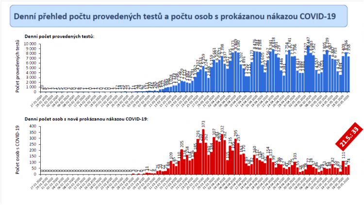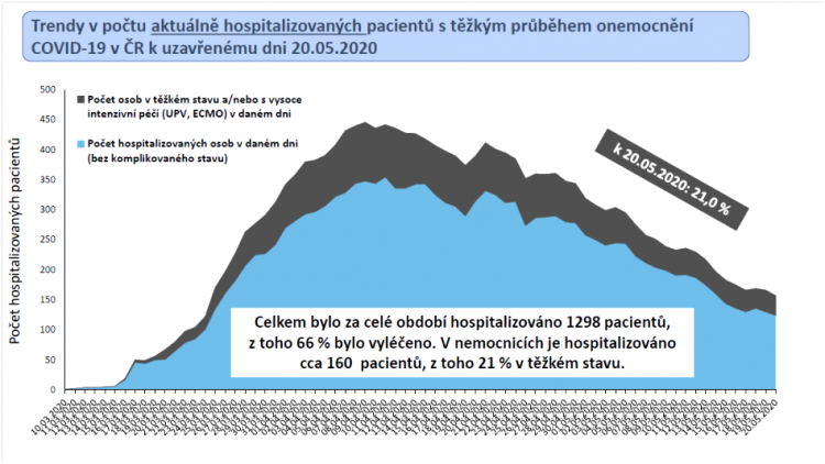 K včerejšímu dni se nákaza podle prezentovaných dat potvrdila u 8.721 nakažených, narůstá však podíl vyléčených, jejichž počet přesáhl 6.000 a tvoří již 66 procent z celkového počtu nakažených. Více než 100 nakažených na 100.000 obyvatel je již jen ve 13 okresech ze 76. Klesá i počet hospitalizovaných na současných 150, což je silný indikátor odeznívající epidemie, stejně jako podíl úmrtí na zhruba 3,5 procenta. Obětí jsou dosud přes tři stovky. Na konci května odhaduje Ústav zdravotnických informací a statistiky (ÚZIS) 9.430 potvrzených případů covid-19.
