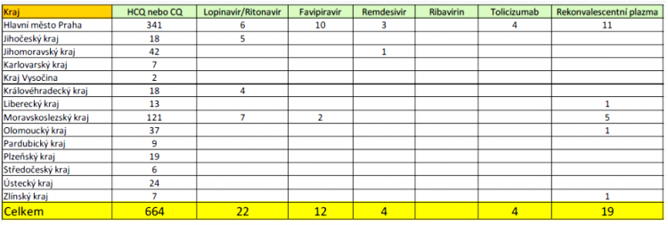 S ohledem na dosavadní klinické zkušenosti vzniká také jednotný národní doporučený postup pro léčbu pacientů s covid-19. Pro léčbu tuzemských pacientů, která vyžaduje většinou jejich souhlas, protože jde o experimentální léčbu, se používá většina léků, které se nasazují i v zahraničí. Nejvíc jich dostalo látku hydroxychlorochin, která byla podaná více než 660 lidem. Je součástí léků, které se používaly v minulosti jako antimalarikum a účinné je i na příznaky revmatoidní artritidy.