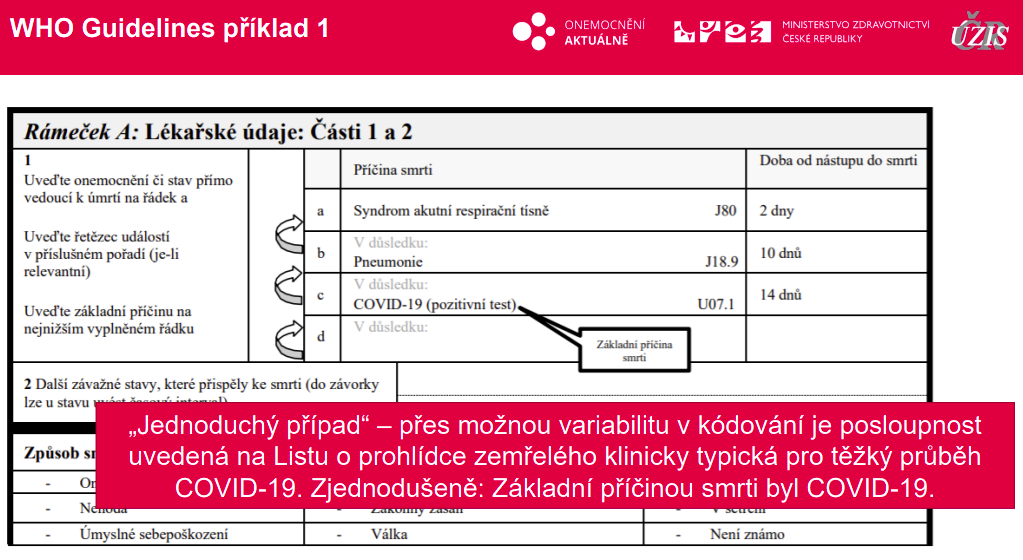 I když už ÚZIS vydal pokyny pro certifikaci a kódování mortality v souvislosti s covid-19, vyhodnocování posloupností na listu o prohlídce zemřelého není jednoduché. Výběr základní příčiny smrti se řídí mezinárodní klasifikací nemocí WHO, která vydala i pokyny pro to, jak vybírat základní příčinu smrti z toho, co je na prohlídce o listu zemřelého uvedeno. Podle Daňkové se ale v certifikační praxi ukazuje, že před aplikací pravidel je třeba se nad listem o prohlídce zemřelého zamyslet – ne vždy totiž odpovídá doporučením WHO a tomu, jak určuje posloupnost covid – pneumonie – respirační selhání. Někdy je tak potřeba ověřit u lékaře, co chtěl certifikací říci.