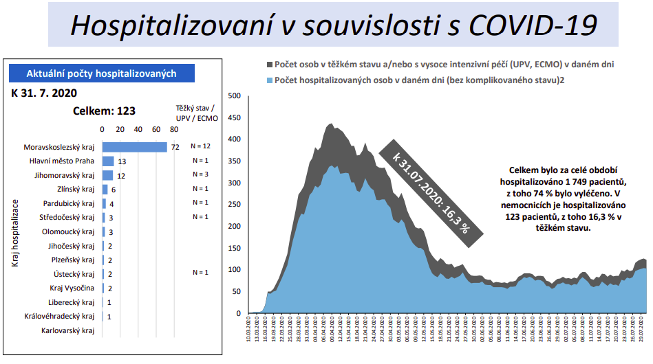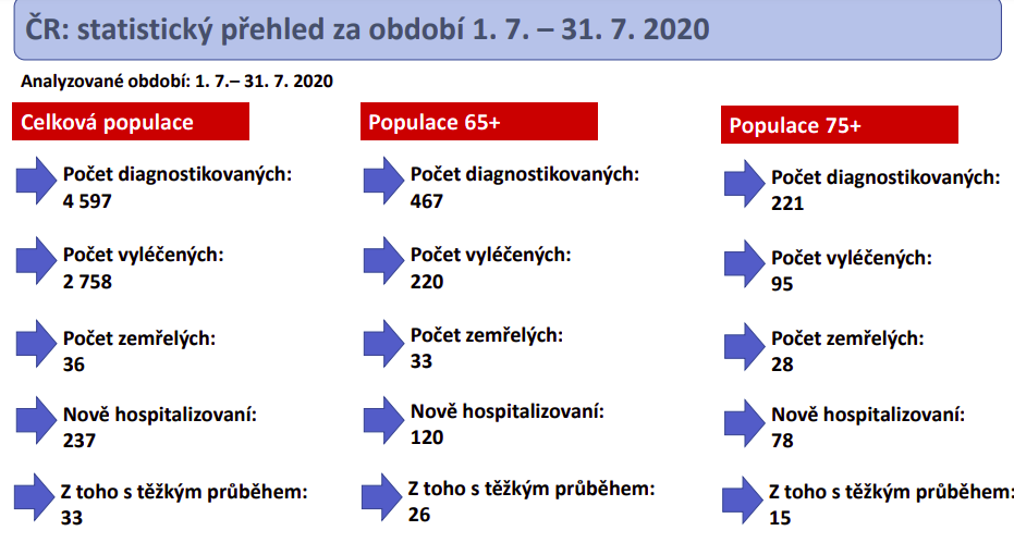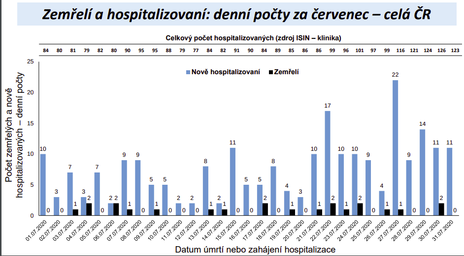 V současnosti tak sice máme poměrně hodně záchytů – celkem za červenec 4500, což je dáno i tím, že se provádí kolem šesti tisíc testů denně, zpravidla se ale jedná o bezpříznakové nebo mírné průběhy. Těžkých průběhů a hospitalizací je velmi málo. V tuto chvíli je zhruba 250 pacientů hospitalizováno s covid a zátěž jednotek intenzivní péče je zanedbatelná – na umělé plicní ventilaci nebo ECMO je dvacítka covid pozitivních lidí. Z celkového počtu těch, u nichž byla v červenci nákaza potvrzena, jich v nemocnici skončilo méně než pět procent; necelé procento má těžký průběh. Nad 75 let je necelým pěti procentům diagnostikovaných, což poukazuje na to, že se daří chránit zranitelné skupiny populace.