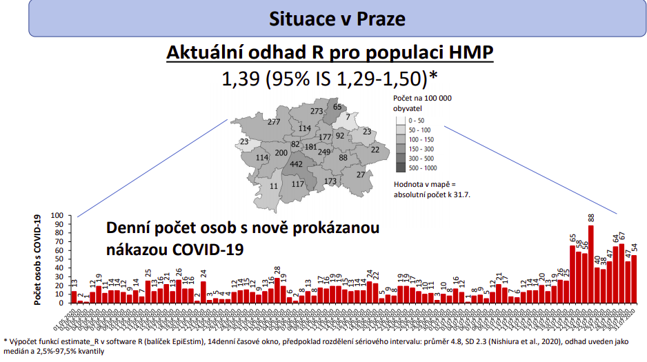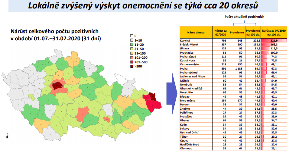 V současnosti jsou dvě hlavní ohniska, a to v Praze a Moravskoslezském kraji. Praha přitom dlouhodobě kolísá na hranici rizika komunitního šíření, kdy 18 procent nákaz nemá jasně prokázaný původ. Podle hygieniků je ale situace kontrolovaná a nejsou zasaženy rizikové skupiny obyvatel. „Praha jako obrovská aglomerace bude vždy místem, kde bude výskyt viru vyšší než v jiných částech republiky. Proto jsme přistoupili k nošení roušek ve zdravotnických zařízeních, stanicích metra, a jakmile to umožní klimatické podmínky, avizujeme, že roušky budou i v nadzemních částech MHD. To je jedno z mála opatření, která můžeme provést. Bohužel se už zapomíná na dodržování odstupu, kde je to možné, protože je to jedno z dalších možných jednoduchých opatření, které má svůj efekt,“ konstatuje ředitelka Hygienické stanice hlavního města Prahy Zdeňka Jágrová.
