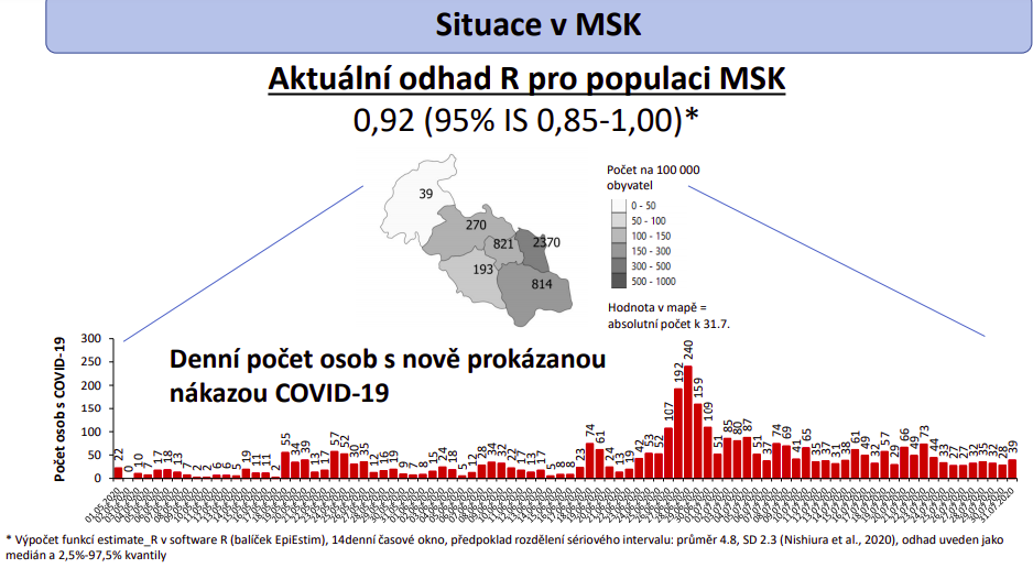 V Moravskoslezském kraji se pak poslední týden situace uklidňuje a dochází k postupnému vyhasínání ohniska. „Nad celým Moravskoslezským krajem je reprodukční číslo pod jedna a i hranice intervalu spolehlivosti nejde nad jedna, takže jsme, doufám, na začátku postupného mizení této epidemie. Přitom v kraji běží dál poměrně intenzivní testování, takže to není falešná nula,“ říká k tomu Ladislav Dušek.
