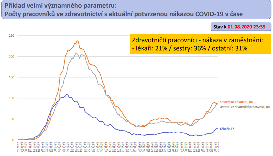 Zatímco počet nově diagnostikovaných a aktuálně pozitivních jsou jen popisnými parametry, tím, co skutečně indikuje riziko, je podíl pozitivních záchytů z provedených testů, eskalace trendu a forma šíření nemoci, riziko pro zranitelné skupiny obyvatel a podíl hospitalizovaných spolu s kapacitou intenzivní lůžkové péče. Velmi významným parametrem je také počet aktuálně nakažených zdravotníků, protože to může paralyzovat chod zdravotnických zařízení. V tuto chvíli je v Česku pozitivních 27 lékařů a 88 sester, což je ovšem z celkového počtu zdravotníků zanedbatelné číslo.