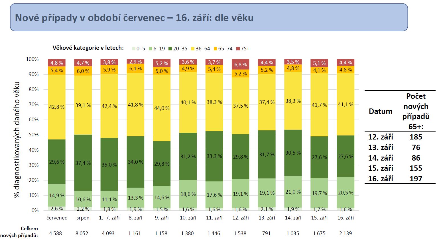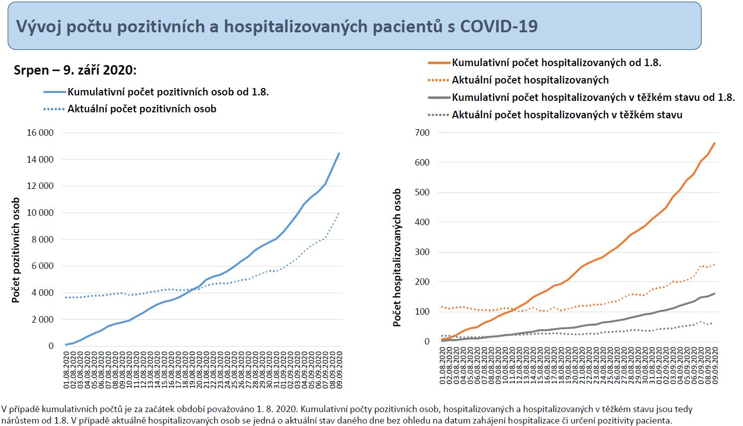 Epidemie koronaviru v Česku nabírá na síle i rychlosti a existuje velké riziko exponenciálního šíření. Většina nakažených má zatím sice lehký průběh nemoci, významně ale v poslední době roste počet hospitalizovaných, vážně nemocných i lidí, kteří s covidem zemřeli. Stát proto znovu plošně zpřísňuje omezení týkající se nošení roušek, vnitřních akcí a otvíracích hodin provozoven. Kapacita českých nemocnic je podle ministra zdravotnictví Adama Vojtěcha zatím více než dostatečná.
