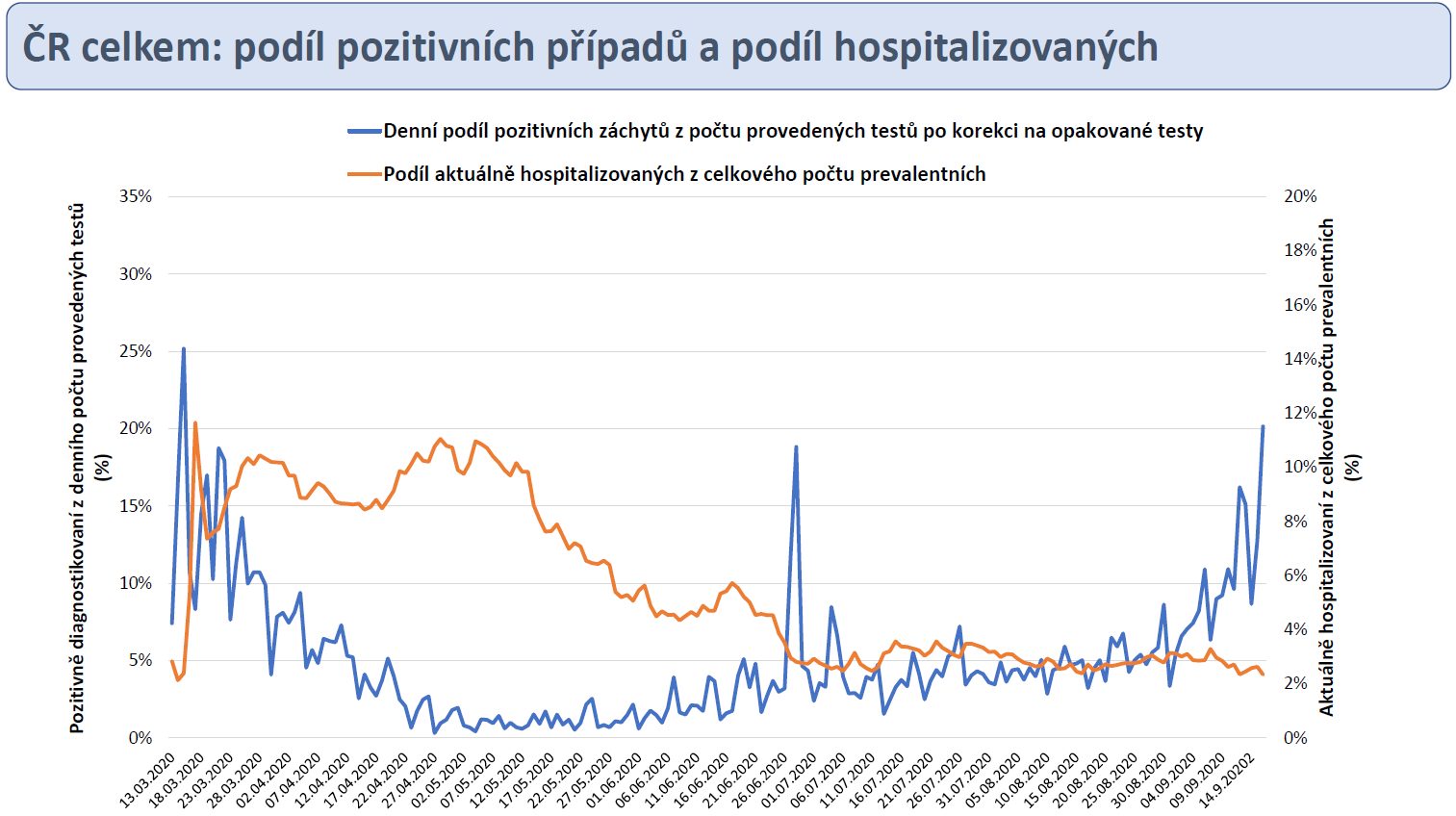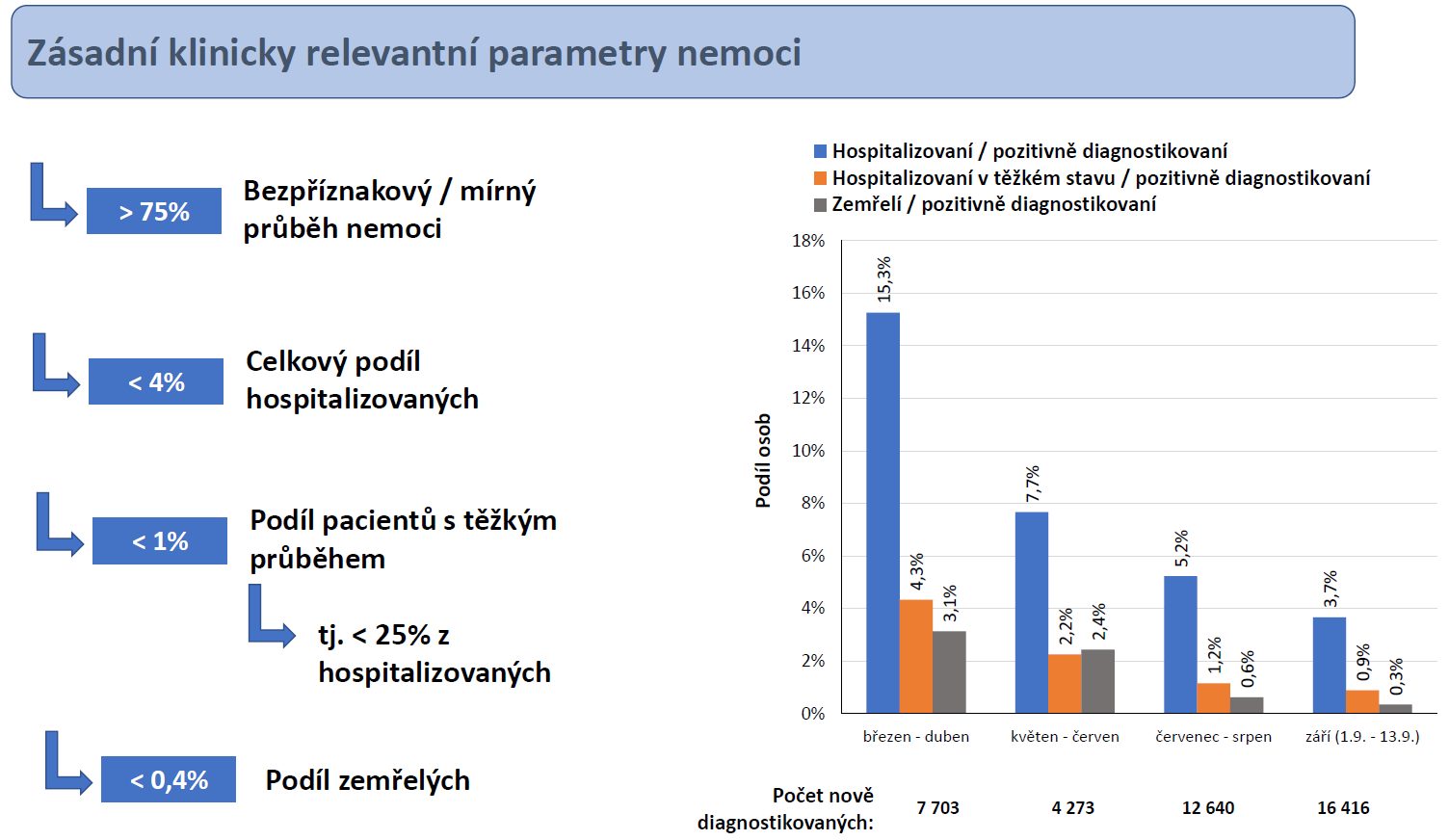 Většina nakažených má zatím sice lehký průběh nemoci, významně ale v poslední době roste počet hospitalizovaných, vážně nemocných i lidí, kteří s covidem zemřeli. Od diagnózy trvá podle Duška zhruba sedm až deset dní, než se rozvinou vážné příznaky. Další týden až dva trvá, než se projeví na počtech hospitalizací.