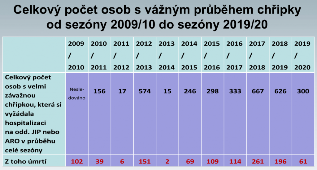 Každoročně tak mnoho set lidí s laboratorně potvrzenou chřipkou vyžaduje intenzivní péči a někteří z nich nakonec komplikacím podlehnou. Zde je třeba zdůraznit, že data publikovaná Státním zdravotním ústavem, která v posledních pěti letech uvádějí 60 až 260 úmrtí za sezónu, jsou ve skutečnosti jen vrcholem ledovce. Dokazuje to každoroční křivka počtu zemřelých, která kulminuje právě v době chřipkových epidemií. Ta prozrazuje, že ve skutečnosti stojí epidemie chřipky život zhruba 1500 až 2000 lidí.