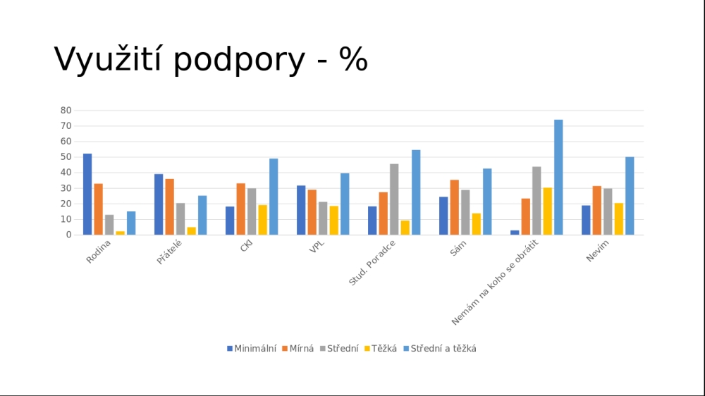 Jednou z otázek v dotazníku také bylo, jakou podporu studenti v případě problémů na poli duševního zdraví využívají. Lidé v nejrizikovější skupině přitom odpovídali, že buď si pomáhají sami, nebo nikoho nemají či nevědí, na koho se obrátit – což vedlo 3. LF k dalším krokům.