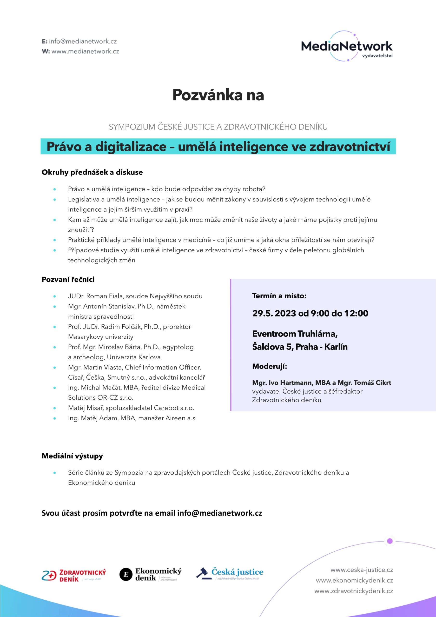Kdo bude odpovídat za chyby robota, jak se budou měnit zákony v souvislosti s vývojem technologií umělé inteligence a jejím širším využitím v praxi či kam až může umělá inteligence zajít – i to jsou otázky, kterými se bude zabývat sympozium Zdravotnického deníku a České justice na téma Právo a digitalizace – umělá inteligence ve zdravotnictví. Akce se bude konat 29. května v eventroomu Truhlárna v pražském Karlíně a přihlásit se na ni můžete na mailu [email protected].