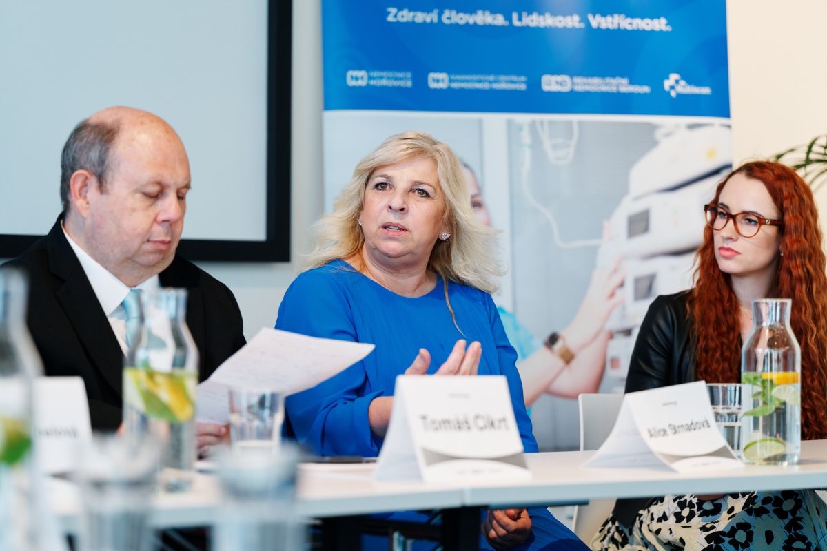 Zleva Tomáš Cikrt, šéfredaktor Zdravotnického deníku, Alice Strnadová, ředitelka odboru ošetřovatelství a nelékařských povolání ministerstva zdravotnictví a hlavní sestra ČR, a Eliška Pousková, staniční sestra Centra duševní rehabilitace Beroun.