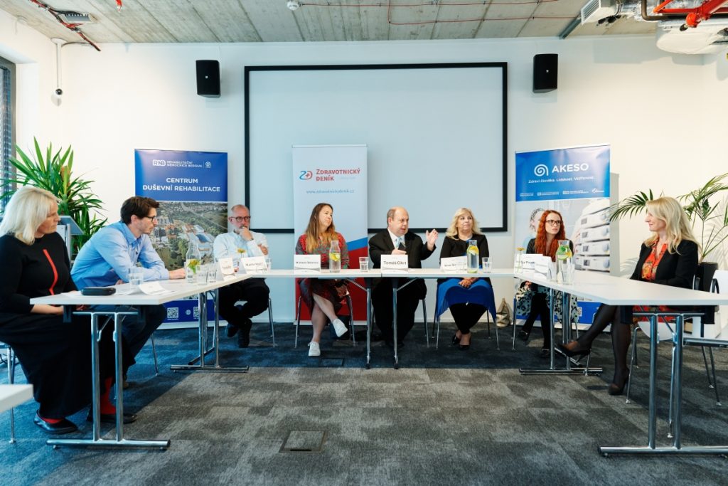 Zleva Věra Perglová, pracovnice pro zdravotní služby Lomikámen, Tomáš Petr, předseda psychiatrické sekce České asociace sester, Martin Hollý, lékař Centra duševní rehabilitace Beroun, Michaela Šebelová, poslankyně, předsedkyně Podvýboru pro oblast specializačního a profesního vzdělávání, vědu a výzkum, Tomáš Cikrt, šéfredaktor Zdravotnického deníku, Alice Strnadová, ředitelka odboru ošetřovatelství a nelékařských povolání ministerstva zdravotnictví a hlavní sestra ČR, Eliška Pousková, staniční sestra Centra duševní rehabilitace Beroun, a Martina Šochmanová, prezidentka České asociace sester.