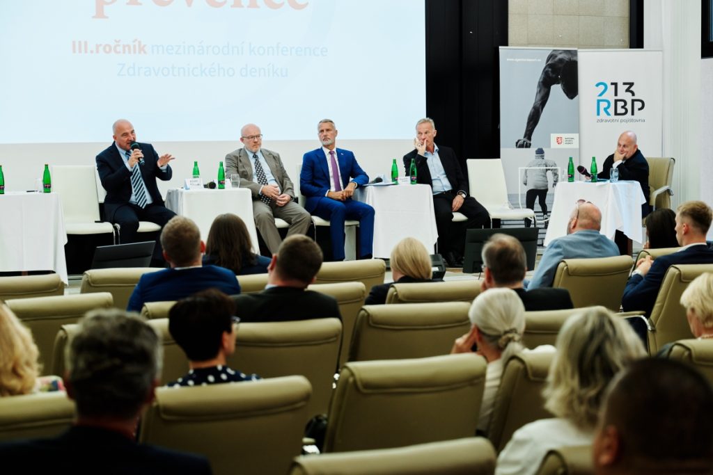 Účastníci prvního bloku konference Ekonomika prevence nazvaného Prevence zdravotních rizik – souhra či nesoulad aktérů (zleva): primář kardiologického oddělení Nemocnice na Homolce Petr Neužil, ředitel Ústavu molekulární a translační medicíny Lékařské fakulty Univerzity Palackého v Olomouci Marian Hajdúch, generální ředitel slovenské Union zdravotní pojišťovny Michal Špaňár, předseda Národní sportovní agentury Ondřej Šebek, vydavatel Zdravotnického deníku a moderátor diskuse Ivo Hartmann a člen Národní ekonomické rady vlády Aleš Rod.
