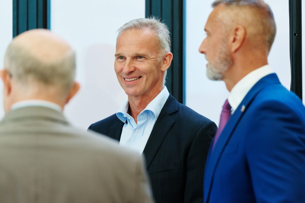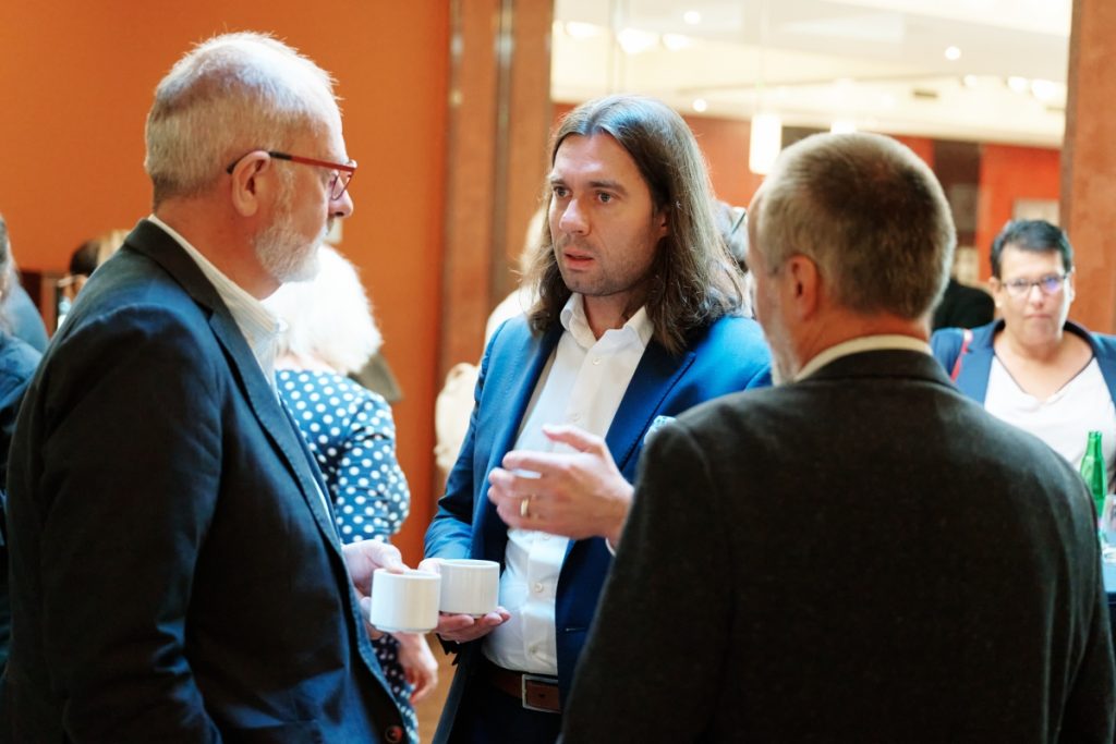 Kuloární diskuze, vlevo psychiatr berounského Centra duševní rehabilitace Martin Hollý a náměstek VZP Ivan Duškov.