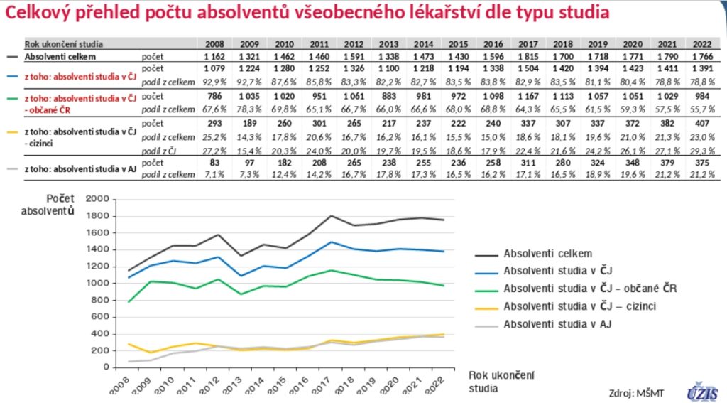 „Zaznívala kritika, jestli je nevychováváme pro Němce nebo farmabyznys. Díky novému registru vidíme, kde mladí lékaři jsou. Realita je, že 90 až 93 procent Čechů začíná po absolutoriu pracovat, respektive studovat. Absolventi se slovenským občanstvím tu zůstávají aktuálně ze 65 procent. Pak tu studuje pár občanů cizích zemí v češtině, ti zůstávají z 83 procent – jinam se jim nechce,“ shrnuje čísla Dušek.