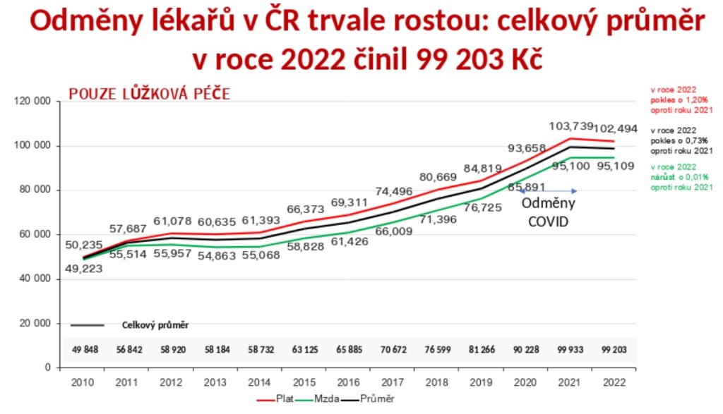 Co se týče finanční stránky, odměny lékařů každoročně rostou. Loni tak brali průměrně téměř sto tisíc měsíčně včetně odměn a přesčasů, což je 2,5 násobek průměrné mzdy.