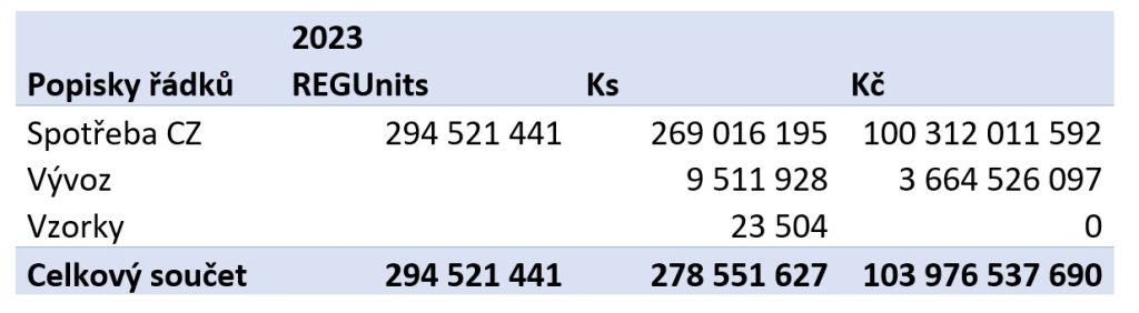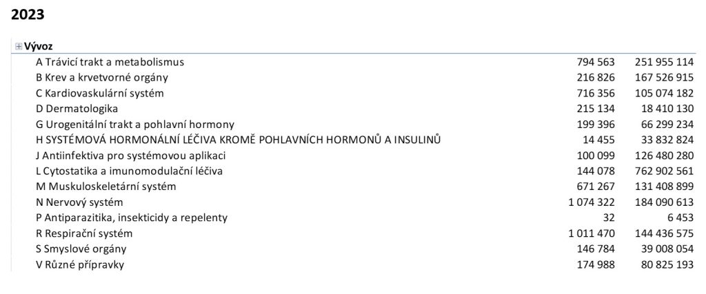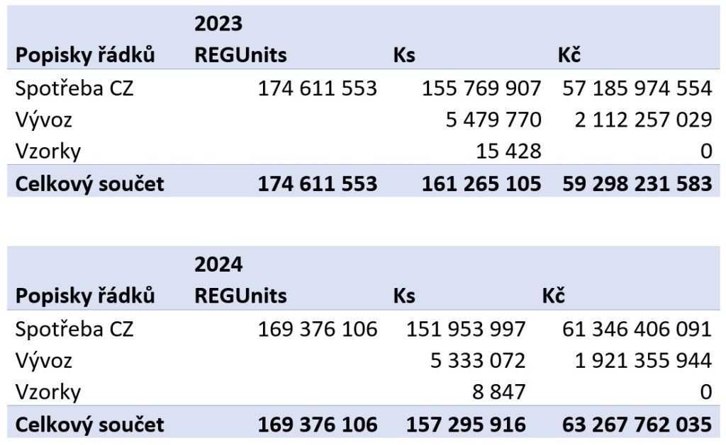 A nakonec, last but not least, ještě jedno obvyklé téma: paralelní exporty. Dnes již všichni víme, že tento druh obchodu není na vině v případě výpadků. Vidíme, že v roce 2024 paralelní obchod zatím za rokem 2023 zaostává, a to skoro o 10 deset procent. Nemusí to ještě nic znamenat, tento druh obchodu, jak známo, nemusí probíhat lineárně, často se odvíjí od konkrétní situace v cílových zemích a vzájemném kurzu dotčených měn. Struktura vývozu je podobná struktuře spotřeby na domácím trhu, vloni i letos vede skupina L. Data v sobě obsahují i případné přesuny zboží organizované přímo držitelem registrace.