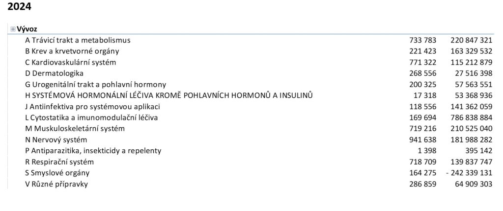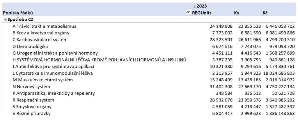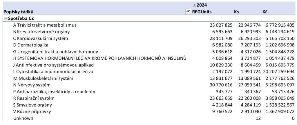 Pokud jde o strukturu nákladů, ta asi nikoho nepřekvapí. Ve finančním objemu tradičně kraluje ATC skupina L (cytostatika a imunomodulační léčiva), a pokud jde o počty balení, pak je to skupina N (nervový systém). V roce 2024 je tomu stejně.