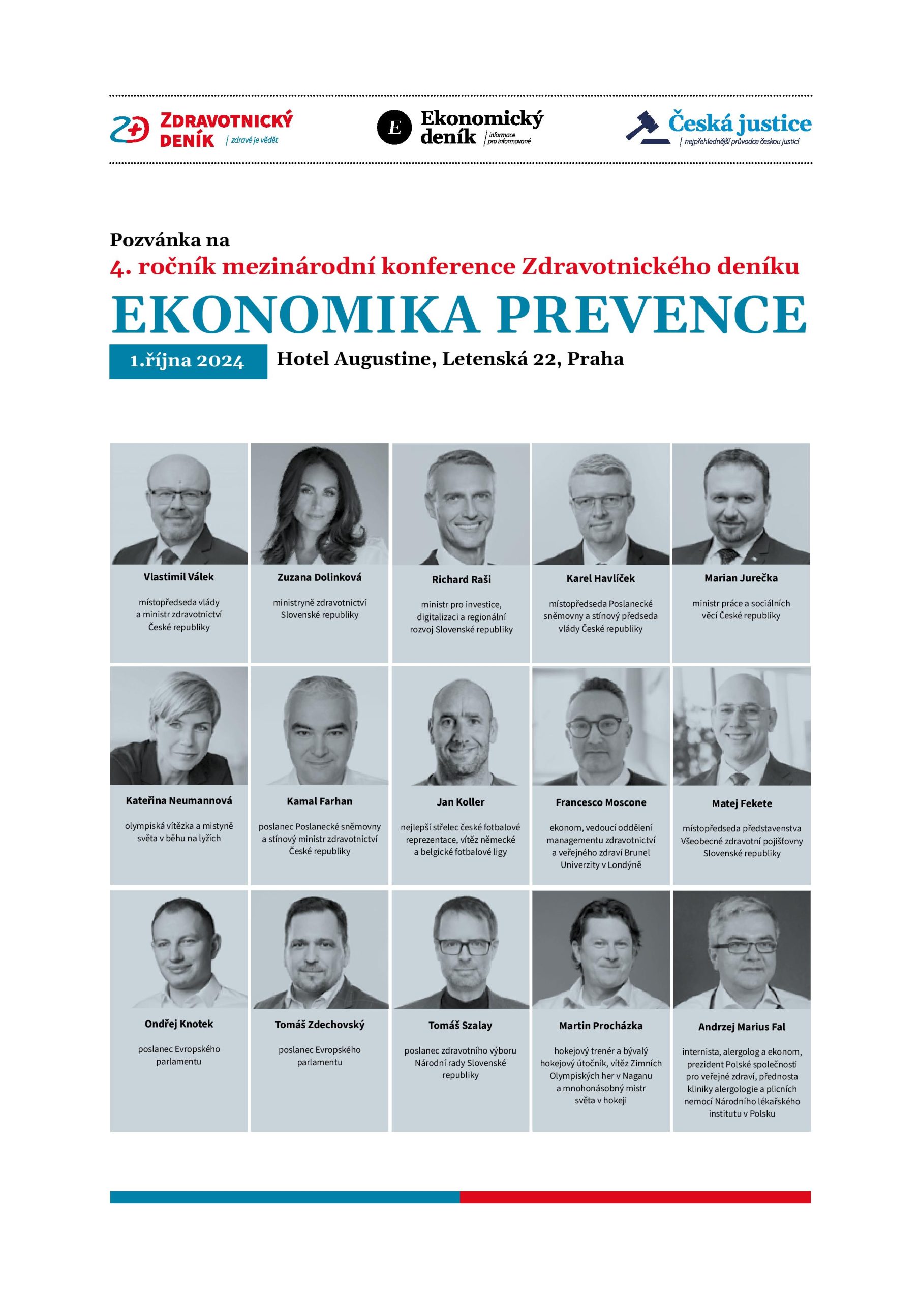 Jak lidi zvednout ze židle nejen při fandění fotbalu či při olympiádě – to bude jedno z témat, kterým se bude věnovat již čtvrtý ročník mezinárodní konference Zdravotnického deníku Ekonomika prevence. O svůj pohled na to, jak populaci motivovat ke zdravému životnímu stylu, se podělí mimo jiné nejlepší střelec české fotbalové reprezentace Jan Koller či olympijská vítězka a mistryně světa v běhu na lyžích Kateřina Neumannová. Své priority představí čeští a slovenští ministři zdravotnictví Vlastimil Válek a Zuzana Dolinková. Na ekonomický a meziresortní aspekt prevence se zaměří slovenský ministr pro investice, regionální rozvoj a digitalizaci Richard Raši, místopředseda Poslanecké sněmovny a stínový premiér Karel Havlíček i ministr práce a sociálních věcí Marian Jurečka. Vystoupí také čeští i slovenští poslanci, europoslanci, šéfové zdravotních pojišťoven či špičkoví lékaři a ekonomové.