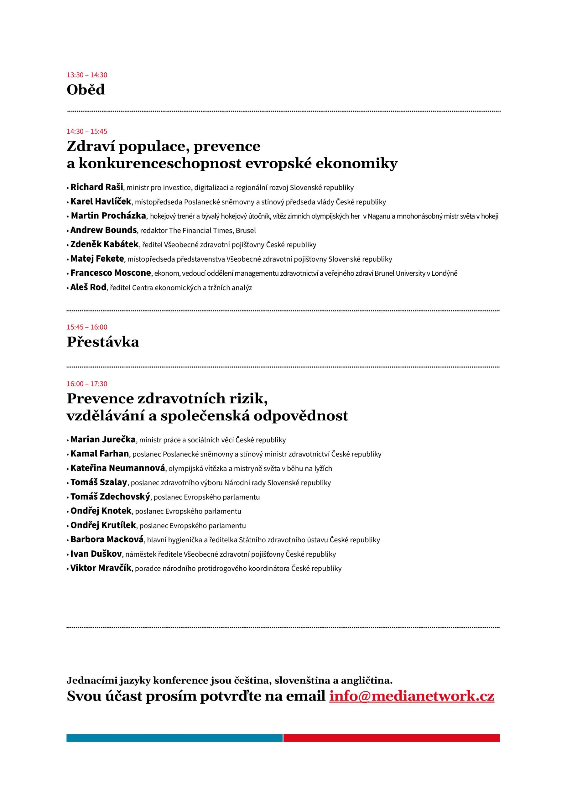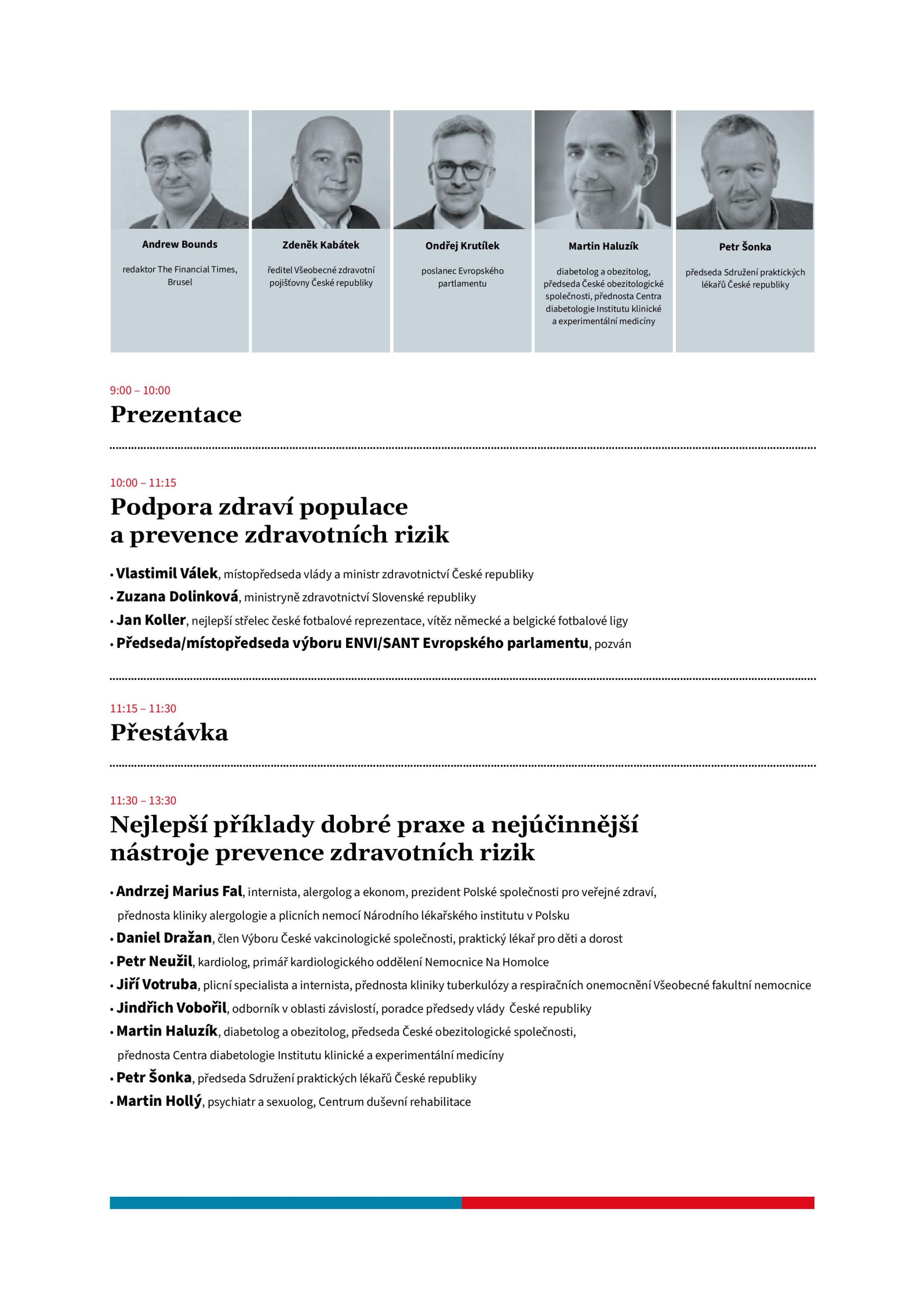 Význam prevence zdravotních rizik pro konkurenceschopnost ekonomiky a jakými vhodnými opatřeními je podpořit, přiblíží vedle ministra Rašiho a stínového premiéra Havlíčka také redaktor The Financial Times Andrew Bounds nebo profesor managementu zdravotnictví a veřejného zdraví Brunel University v Londýně Francesco Moscone. Efektivitu výdajů do prevence zdravotních rizik zhodnotí ředitel Všeobecné zdravotní pojišťovny České republiky Zdeněk Kabátek a místopředseda představenstva Všeobecné zdravotní pojišťovny Slovenské republiky Matej Fekete.